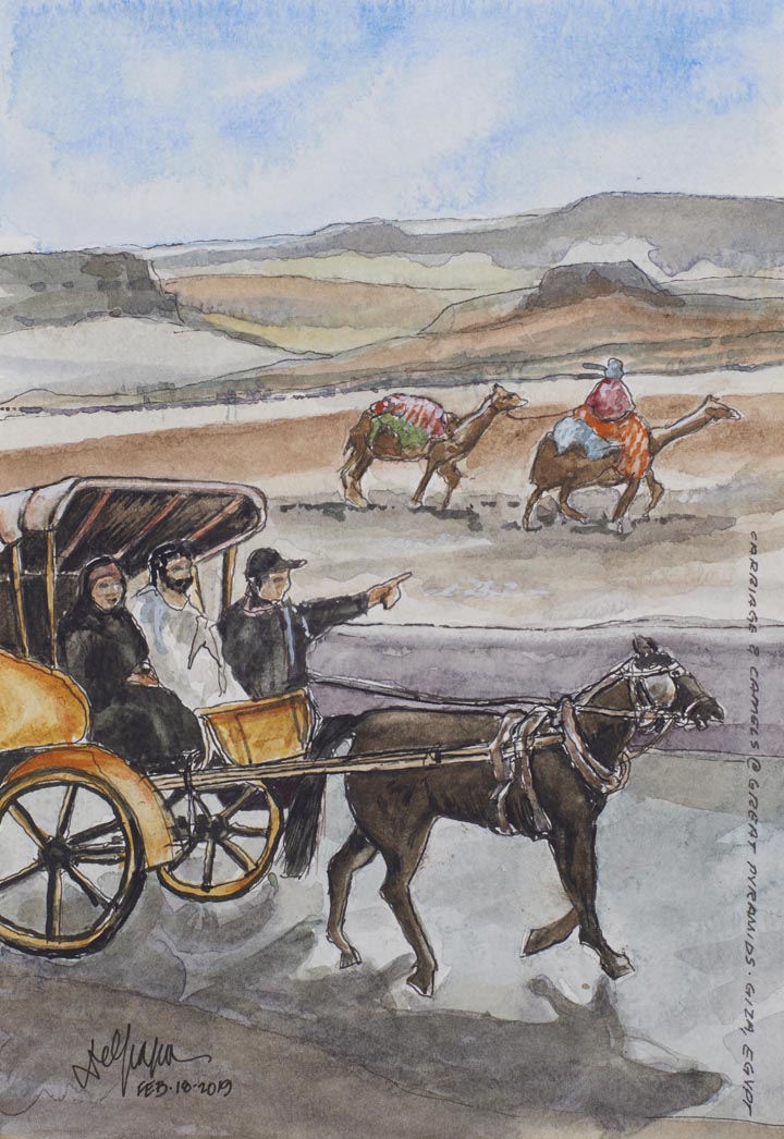A vibrant small-scale watercolor capturing a lively scene near the Pyramids of Giza in Egypt. When you visit, it’s common to see tourists and locals passing by in colorful horse-drawn carriages—and camels are just part of the everyday backdrop. This piece brings global character and movement to any wall, making it a perfect fit for eclectic home decor, travel-inspired hospitality spaces, or as a unique cultural gift.