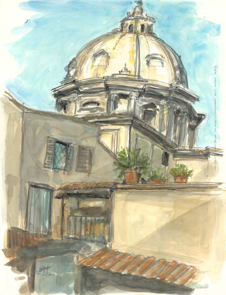 This original watercolor was painted from a memory of one of our visits to Rome, Italy, when we rented an apartment with this view of a cathedral dome through our bedroom window. The soft light and layered rooftops made the scene feel both grand and personal—an everyday moment framed by something timeless. There’s a quiet stillness in it that reminds me how travel often lingers in the small things we see from where we stay.