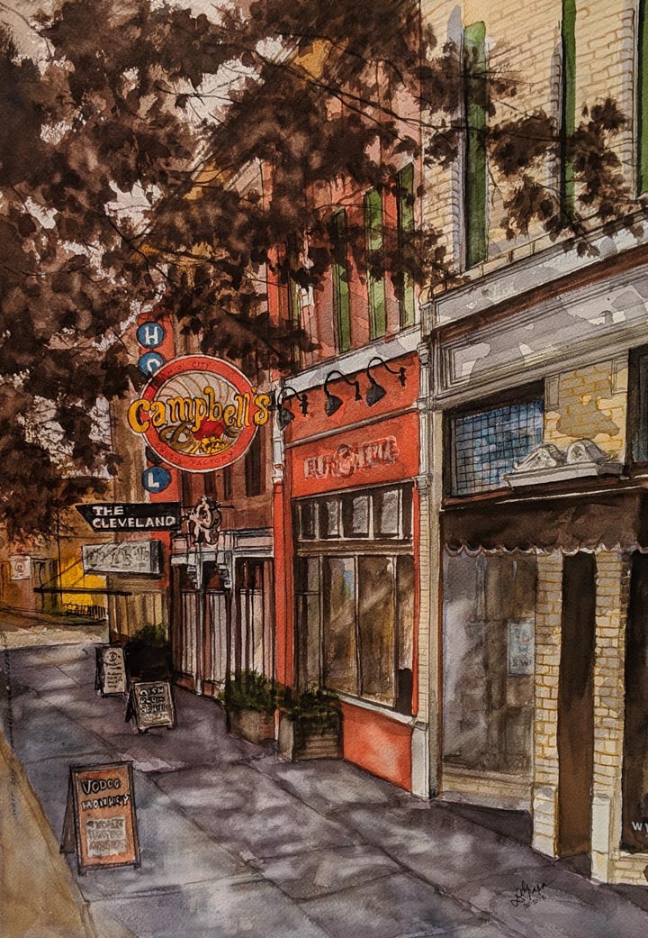 Most of the shops pictured here no longer exist. Campbell’s, a wonderful popcorn and confection shop, was one of them—it moved out several years ago. This painting actually hung in the shop before they closed, which makes it all the more meaningful. A glimpse of a familiar street as it once was, captured in watercolor. A quiet tribute to neighborhood change and the spaces we remember—fitting for home decor, guest areas, or local hospitality interiors.