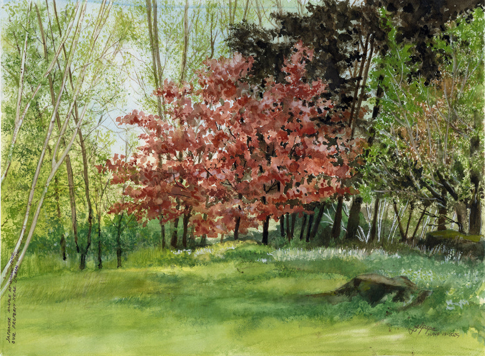 This watercolor recalls the time we lived in the country, where a crowded grove of locust trees grew on our property. When we thinned the grove, we discovered a stunted Japanese maple hidden among them. Free of the competition, the tree flourished and soon became a gorgeous addition to the pond, its graceful branches and reflections bringing beauty to the landscape.