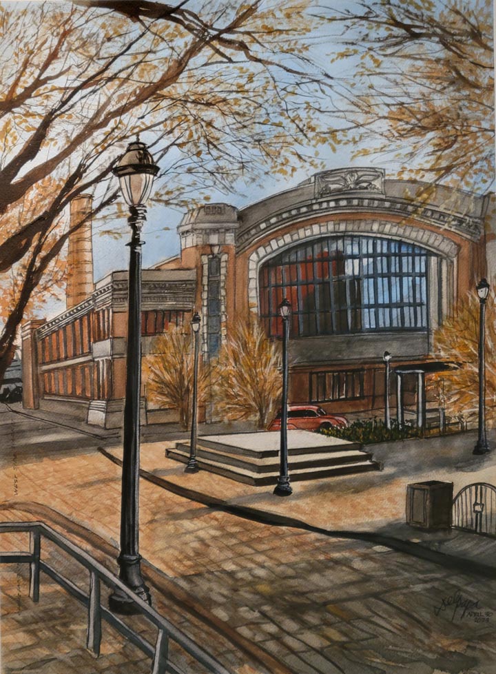 A watercolor view of the 1912 market building, seen from the park just across the street. The symmetry, signage, and sense of history in the architecture caught my eye. This scene holds the rhythm of a neighborhood rooted in time—familiar to Clevelanders and welcoming to anyone who appreciates old city charm. A fitting piece for regional home decor, guest spaces, or quiet corners of hospitality interiors.